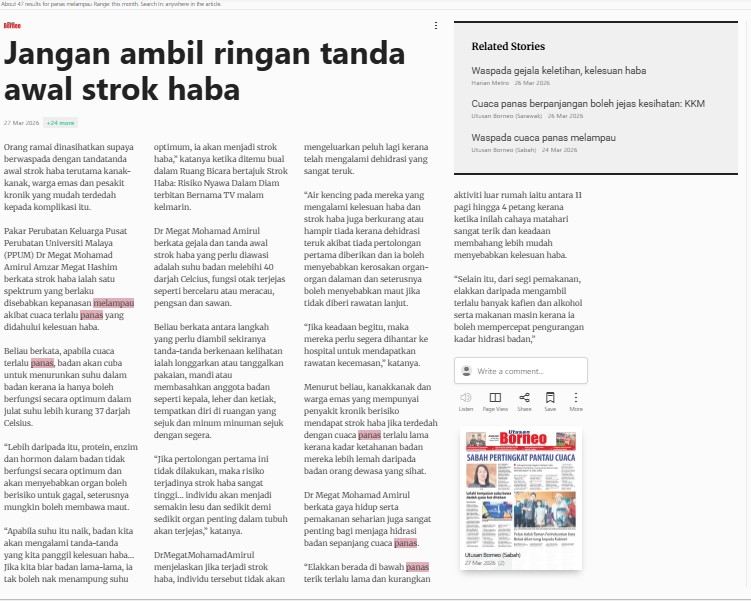 Bernama (2026) Jangan Ambil Ringan Tanda Awal Strok Haba. Utusan Borneo (Sabah). |