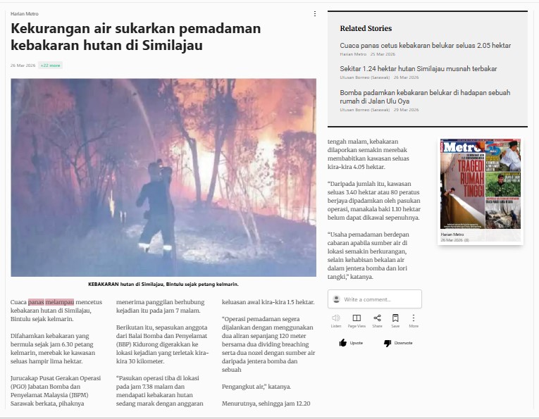Bernama (2026) Kekurangan Air Sukarkan Pemadaman Kebakaran Hutan Di Similajau. Harian Metro. |