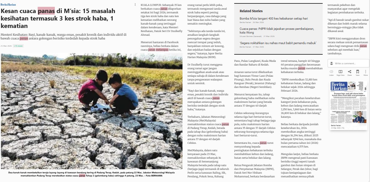 Bernama (2026) Kesan Cuaca Panas Di M’sia: 15 Masalah Kesihatan Termasuk 3 Kes Strok Haba, 1 Kematian. Berita Harian. |