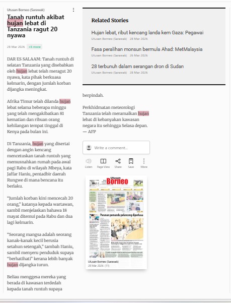 Bernama (2026) Tanah Runtuh Akibat Hujan Lebat Di Tanzania Ragut 20 Nyawa. Utusan Borneo (Sarawak). |