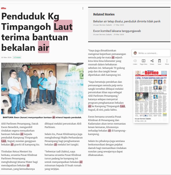 Bernama (2026) Penduduk Kg Timpangoh Laut terima bantuan bekalan air. Utusan Borneo (Sabah). |