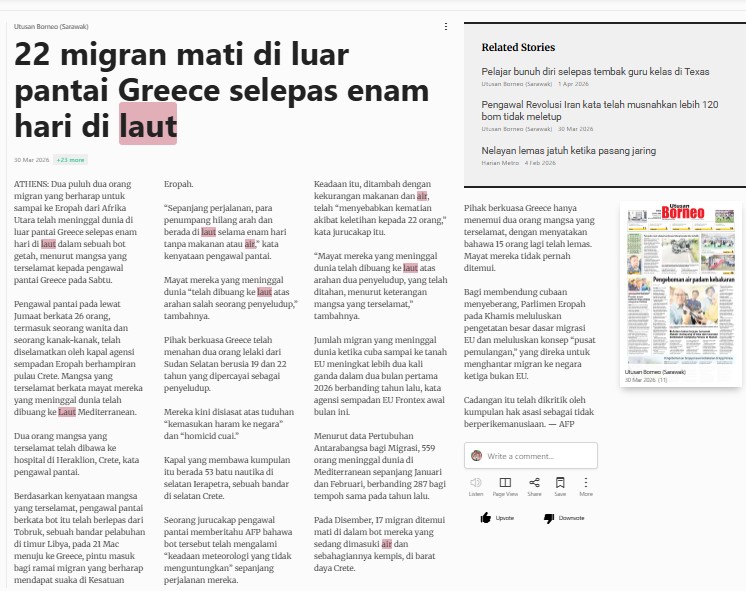 Bernama (2026) 22 Migran Mati Di Luar Pantai Greece Selepas Enam Hari Di Laut. Utusan Borneo (Sarawak). |