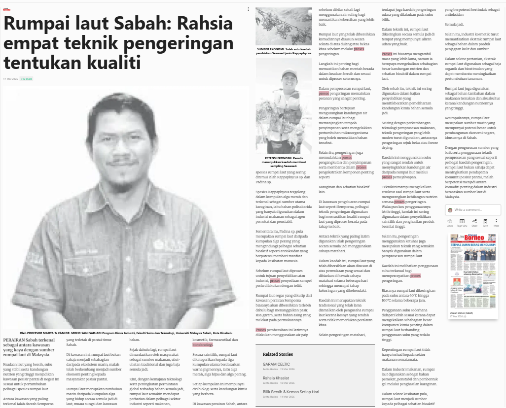 Bernama (2026) Rumpai laut Sabah: Rahsia empat teknik pengeringan tentukan kualiti. Utusan Borneo (Sabah). |