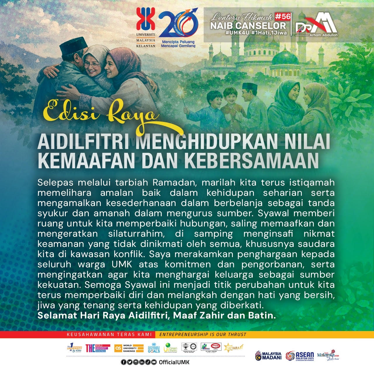 (Edisi Raya) Aidilfitri menghidupkan nilai kemaafan dan kebersamaan Assalamualaikum warahmatullahi wabarakatuh, Salam UMK4U, 1 Hati 1 Jiwa. Setelah sebulan kita ditarbiah dalam madrasah Ramadan, marilah kita terus memelihara amalan-amalan baik yang telah dibina sepanjang bulan yang penuh keberkatan ini. Usah dibiarkan ia berlalu begitu sahaja, sebaliknya diperkukuh dan diistiqamahkan dalam kehidupan seharian. Apabila amalan tersebut menjadi sebahagian daripada rutin hidup kita sehingga terasa kekurangan dan kegelisahan apabila ditinggalkan, itulah tanda bahawa tarbiah Ramadan telah benar-benar meresap dan membentuk peribadi kita. Dalam kegembiraan menyambut Syawal, saya ingin mengajak seluruh warga kampus agar terus mengamalkan sikap bersederhana, khususnya dalam perbelanjaan. Kesederhanaan dalam kehidupan berkeluarga mendidik kita untuk lebih menghargai, mengelakkan pembaziran serta sentiasa bersyukur dengan nikmat yang dikurniakan. Nilai ini juga amat penting dalam kita memikul amanah di tempat kerja, agar setiap sumber diurus secara berhemah dan dimanfaatkan sebaiknya demi Hari Raya merupakan waktu terbaik untuk kita kembali kepada keluarga, memohon maaf, memperbaiki hubungan serta mengeratkan silaturrahim. Dalam kesibukan melaksanakan tanggungjawab harian, mungkin ada kekhilafan yang terlepas pandang dan hati yang terguris tanpa disedari. Justeru, Syawal membuka ruang untuk kita merendahkan ego, mendahulukan kemaafan dan membina semula hubungan dengan lebih baik. Dalam masa yang sama, kita juga tidak boleh menafikan realiti dunia hari ini. Konflik yang berlarutan di Timur Tengah mengingatkan kita bahawa tidak semua berpeluang menyambut Syawal dalam suasana aman dan sempurna. Ada yang kehilangan insan tersayang, terpisah daripada keluarga, malah hidup dalam ketakutan. Keadaan ini wajar menimbulkan rasa insaf dan syukur dalam diri kita bahawa kebersamaan yang dinikmati hari ini adalah satu nikmat yang amat besar. Pada kesempatan ini, saya merakamkan setinggi-tinggi penghargaan dan terima kasih kepada seluruh warga UMK atas komitmen dan pengorbanan yang dicurahkan. Di sebalik setiap usaha dan pencapaian, terdapat sokongan keluarga yang menjadi sumber kekuatan kita. Hargailah mereka yang sentiasa bersama kita, kerana ketenangan di rumah sering menjadi asas kepada kecemerlangan di tempat kerja. Akhir kata, marilah kita menjadikan Syawal ini sebagai titik kesedaran untuk terus memperbaiki diri supaya menjadi insan yang lebih insaf, menghargai dan bertanggungjawab dalam setiap peranan yang dipikul, sama ada sebagai ahli keluarga mahupun warga universiti. Selamat Hari Raya Aidilfitri, maaf zahir dan batin. Semoga kita terus melangkah dengan hati yang bersih, jiwa yang tenang dan kehidupan yang diberkati. Sekian, terima kasih. Ikhlas, |