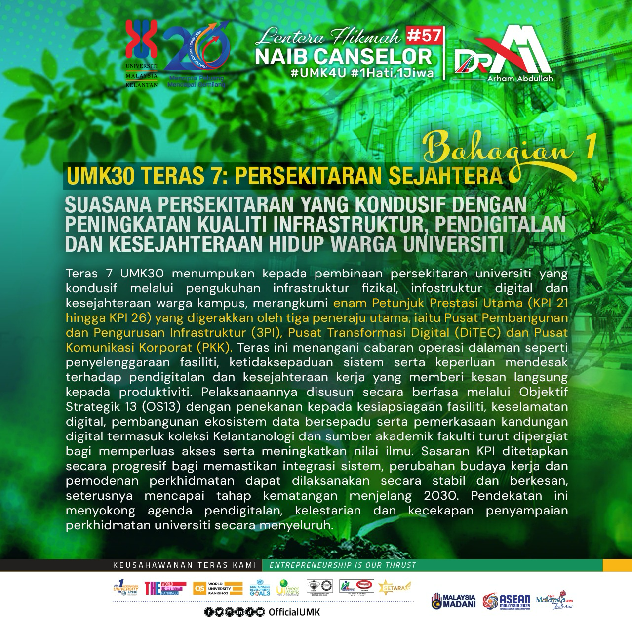 UMK30: TERAS 7 – SUASANA PERSEKITARAN YANG KONDUSIF DENGAN PENINGKATAN KUALITI INFRASTRUKTUR, PENDIGITALAN DAN KESEJAHTERAAN HIDUP WARGA UNIVERSITI (Bahagian 1) Assalamualaikum Warahmatullahi Wabarakatuh. Salam UMK4U, 1 Hati 1 Jiwa. Pada minggu ini dan minggu hadapan, saya ingin berkongsi mengenai Teras 7 dalam UMK30, iaitu usaha mewujudkan suasana persekitaran yang kondusif melalui peningkatan kualiti infrastruktur, pendigitalan serta kesejahteraan hidup warga universiti. Teras ini merangkumi enam Petunjuk Prestasi Utama (KPI 21 hingga KPI 26) yang digerakkan oleh tiga peneraju utama, iaitu Pusat Pembangunan dan Pengurusan Infrastruktur (3PI), Pusat Transformasi Digital (DiTEC) dan Pusat Komunikasi Korporat (PKK). Secara khususnya, KPI 21 dan KPI 24 dipacu oleh 3PI dengan penekanan terhadap kesiapsiagaan infrastruktur serta kesejahteraan fizikal kampus. KPI 22 dan KPI 23 pula diterajui oleh DiTEC bagi memperkukuh infostruktur digital serta mempercepat transformasi perpustakaan secara pintar dan bersepadu. Manakala peranan PKK dalam menerajui KPI 25 dan KPI 26 akan dihuraikan dengan lebih lanjut pada minggu hadapan. Dalam konteks pembangunan universiti, tumpuan lazimnya diberikan kepada pencapaian akademik dan keterlihatan luaran. Namun demikian, cabaran sebenar sering tertumpu pada aspek operasi dalaman yang kurang kelihatan. Infrastruktur memerlukan penyelenggaraan berterusan dalam keadaan sumber yang terhad, manakala sistem sedia ada masih belum bersepadu dan sebahagiannya beroperasi secara silo. Pada masa yang sama, keperluan untuk memperkukuh ekosistem digital semakin mendesak. Selain itu, kesejahteraan warga kampus turut meliputi tekanan kerja, keseimbangan kehidupan dan kualiti persekitaran turut memberi kesan langsung terhadap produktiviti serta prestasi organisasi. Teras 7 dirangka dengan memberi penekanan kepada tiga komponen utama, iaitu infrastruktur fizikal, infostruktur digital dan kesejahteraan insan sebagai asas pengukuhan ekosistem universiti secara menyeluruh. Teras ini secara langsung menyokong Lonjakan 6 dan Lonjakan 10 RPTM melalui pemantapan tadbir urus yang tangkas, penggunaan data secara strategik serta pendigitalan bagi meningkatkan kecekapan penyampaian perkhidmatan. Pada masa yang sama, pelaksanaan elemen kampus hijau dan kelestarian turut melengkapi usaha ini sejajar dengan Lonjakan 9 ke arah pembangunan persekitaran yang lebih seimbang dan mampan. Di bawah Objektif Strategi 13 (OS13), pendekatan yang diambil melangkaui aspek pembinaan atau penaiktarafan kemudahan semata-mata, sebaliknya memberi tumpuan kepada impak terhadap kecekapan operasi universiti. Keutamaan diberikan kepada kesiapsiagaan fasiliti, kecekapan tenaga, keselamatan digital serta pembangunan Ekosistem Data Bersepadu. Di samping itu, usaha memperkasa kandungan digital termasuk koleksi Kelantanologi dan sumber akademik fakulti turut dipergiat bagi memperluas akses serta meningkatkan nilai ilmu. Sasaran bagi KPI 21, KPI 22 dan KPI 23 ditetapkan secara realistik berasaskan keupayaan semasa, dengan permulaan 20% pada tahun 2026 sebagai asas untuk memperkukuh penyelarasan infrastruktur, integrasi sistem yang masih belum menyeluruh serta penetapan standard operasi yang lebih jelas, sekali gus mengurangkan kebergantungan kepada proses manual. Keyakinan ini disandarkan kepada pendekatan pelaksanaan secara berfasa, dengan peningkatan sasaran kepada 40%, 60% dan 80% yang mengambil kira realiti pembangunan sistem, keperluan penyelarasan antara platform serta perubahan budaya kerja warga universiti yang memerlukan tempoh penyesuaian. Pendekatan ini penting bagi memastikan setiap intervensi dilaksanakan secara stabil, berfungsi dengan berkesan dan dapat dimanfaatkan secara menyeluruh. Melalui langkah yang tersusun ini, universiti mensasarkan tahap kematangan sistem dapat dicapai menjelang tahun 2030, dengan infrastruktur dan infostruktur beroperasi secara bersepadu bagi menyokong kecekapan operasi serta penyampaian perkhidmatan yang optimum. Bagi KPI 23 yang melibatkan transformasi digital perpustakaan, pendekatan berperingkat dilaksanakan dengan menetapkan sasaran awal pada 10%, 25% dan 45%. Pendekatan ini bersesuaian memandangkan proses pendigitalan bukan sahaja melibatkan teknologi, malah merangkumi aspek pengurusan kandungan, pematuhan serta kesiapsiagaan sistem. Fasa awal ini dilihat sebagai tempoh membina asas yang kukuh sebelum pelaksanaan diperluas ke peringkat seterusnya secara lebih tersusun dan berkeyakinan. Sehubungan dengan itu, peningkatan kepada 75% dan 85% dijangka dapat dicapai dengan lebih lancar apabila sistem semakin stabil dan skala pelaksanaan diperluas secara berkesan. Pada minggu hadapan, saya akan mengupas aspek kesejahteraan warga universiti serta peranan komunikasi strategik dalam memperkukuh keupayaan organisasi secara menyeluruh. Sekian, terima kasih. Ikhlas, |