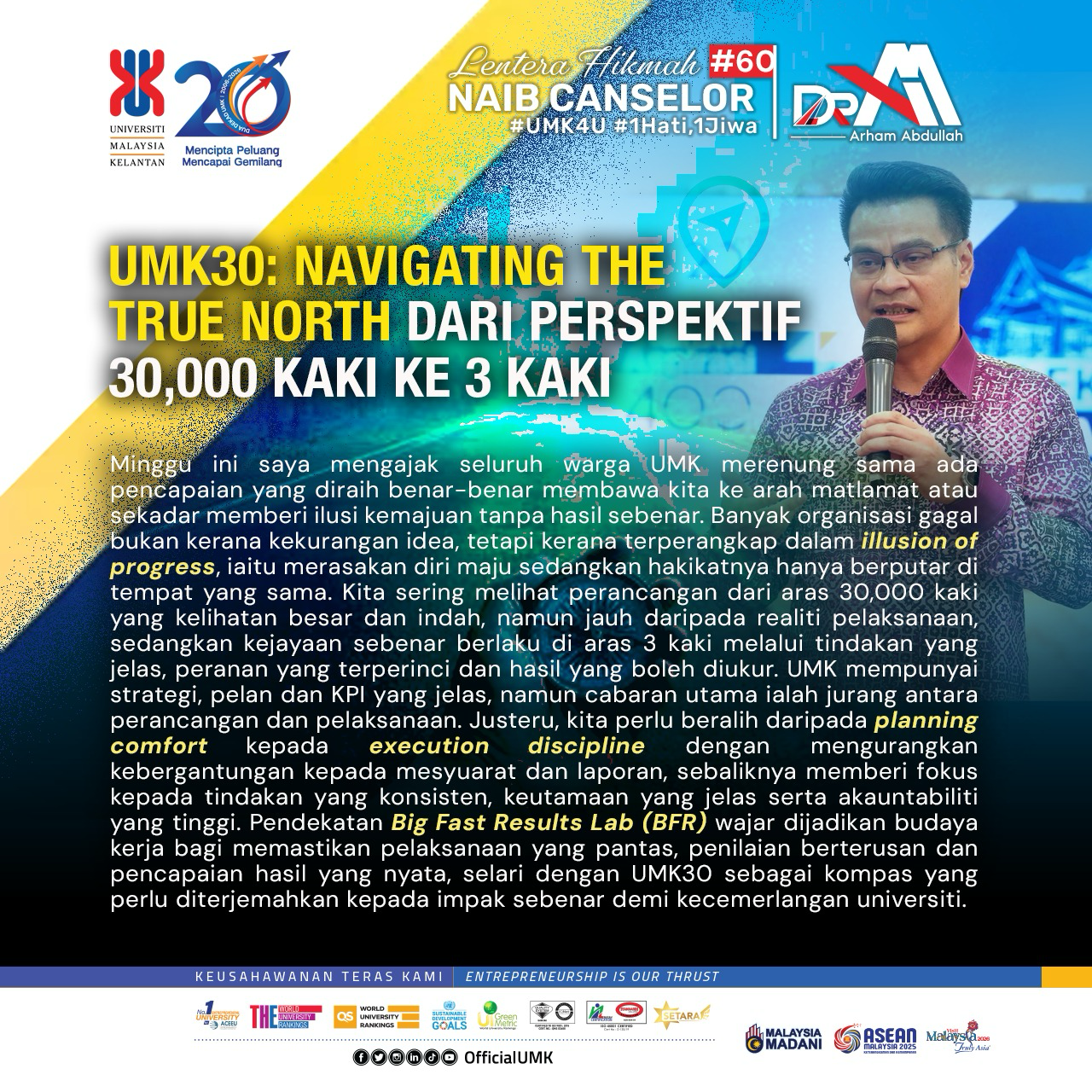 UMK30: NAVIGATING THE TRUE NORTH DARI PERSPEKTIF 30,000 KAKI KE 3 KAKI Assalamualaikum Warahmatullahi Wabarakatuh. Salam UMK4U, 1 Hati 1 Jiwa. Minggu ini saya ingin mengajak kita semua merenung sejenak, adakah kita benar-benar berpuas hati dengan apa yang telah kita capai di UMK hari ini atau kita sekadar selesa dalam pergerakan yang kelihatan sibuk tetapi tidak membawa kita ke arah yang tepat. Kita perlu bergerak seiring dengan kepantasan dunia. Namun, kelajuan tanpa arah yang jelas hanya akan menyebabkan kita tersasar daripada matlamat sebenar. Sepanjang tempoh ini, saya melihat potensi besar dalam UMK serta komitmen tinggi warganya. Namun, cabaran utama yang masih kita hadapi ialah jurang antara perancangan dan pelaksanaan. UMK tidak kekurangan strategi. Kita mempunyai pelan, KPI dan kerangka tindakan yang lengkap. Tetapi persoalannya, sejauh mana semua ini benar-benar diterjemahkan dalam tindakan harian yang berkesan? Banyak organisasi gagal bukan kerana kurang idea, tetapi kerana terperangkap dalam “illusion of progress” iaitu merasakan diri maju, sedangkan hakikatnya hanya berputar di tempat yang sama. Kita sering berada di aras 30,000 kaki, melihat perancangan secara besar dan indah, tetapi jauh daripada realiti pelaksanaan sebenar. Sedangkan kejayaan sebenar berlaku di aras 3 kaki sahaja di lapangan, melalui tindakan yang jelas, peranan yang terperinci dan hasil yang boleh dilihat. Saya mahu UMK menjadi institusi yang cekap melaksana dan berdisiplin dalam menyempurnakan setiap agenda. UMK30 ialah kompas kita, namun kompas hanya bermakna jika disertai tindakan. Saya sering mengajak warga UMK untuk menjadikan Majlis Naratif Aspirasi Naib Canselor sebagai ruang terbuka bagi menilai pencapaian dan keberkesanan setiap teras yang kita telah rancangkan. Untuk melangkah lebih jauh, kita perlu beralih daripada planning comfort kepada “execution discipline”. Kurangkan kebergantungan kepada mesyuarat dan laporan, dan fokus kepada tindakan yang konsisten, keutamaan yang jelas serta akauntabiliti. Saya menyeru agar pendekatan “Big Fast Results Lab (BFR)” diadaptasi sebagai budaya kerja. Pendekatan ini menekankan pelaksanaan yang pantas, penilaian berterusan dan penambahbaikan berasaskan hasil sebenar. Perubahan ini menuntut anjakan budaya daripada bekerja secara silo kepada sistem yang bersepadu, dan daripada merancang kepada melaksanakan secara konsisten sehingga mencapai hasil. Sebagai nakhoda, saya komited untuk membina kepercayaan dan menyatukan kekuatan kita. Strategi sudah ada, kini tiba masanya untuk membuktikan keberkesanannya. Saya yakin, dengan kesatuan, kejelasan dan kepercayaan, UMK mampu melakar legasi yang lebih gemilang. Sekian, terima kasih. Ikhlas, |