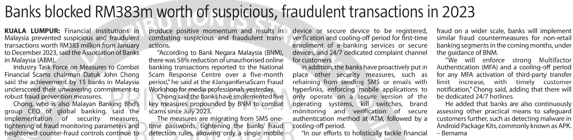 Bernama (2024) Banks blocked RM383m worth of suspicious, fraudulent transactions in 2023. The Sun Malaysia. |