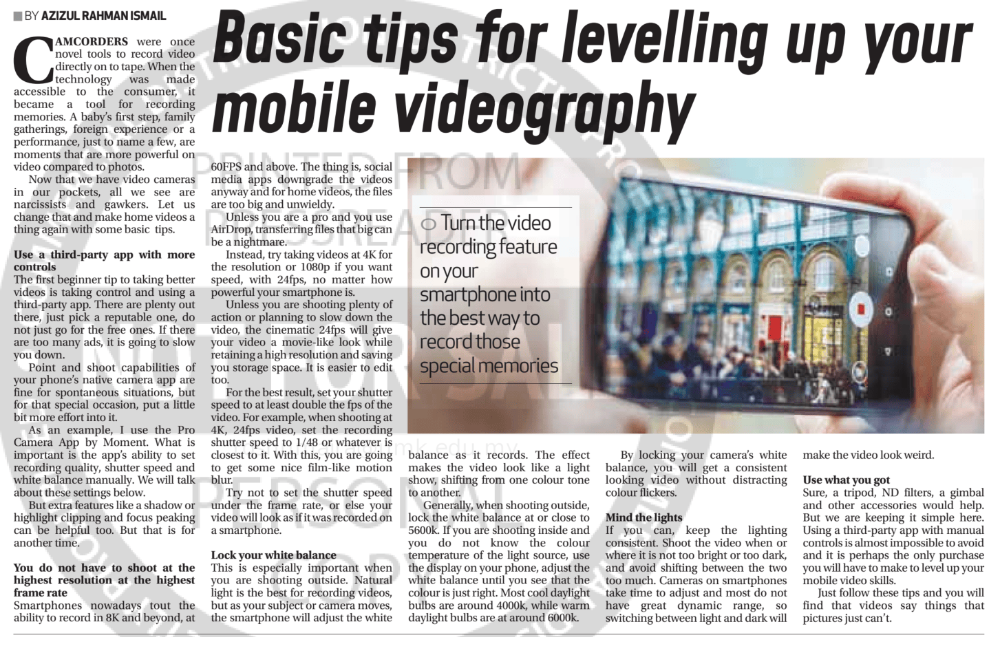Azizul Rahman Ismail (2021) Basic tips for levelling up your mobile videography. The Sun Malaysia. |