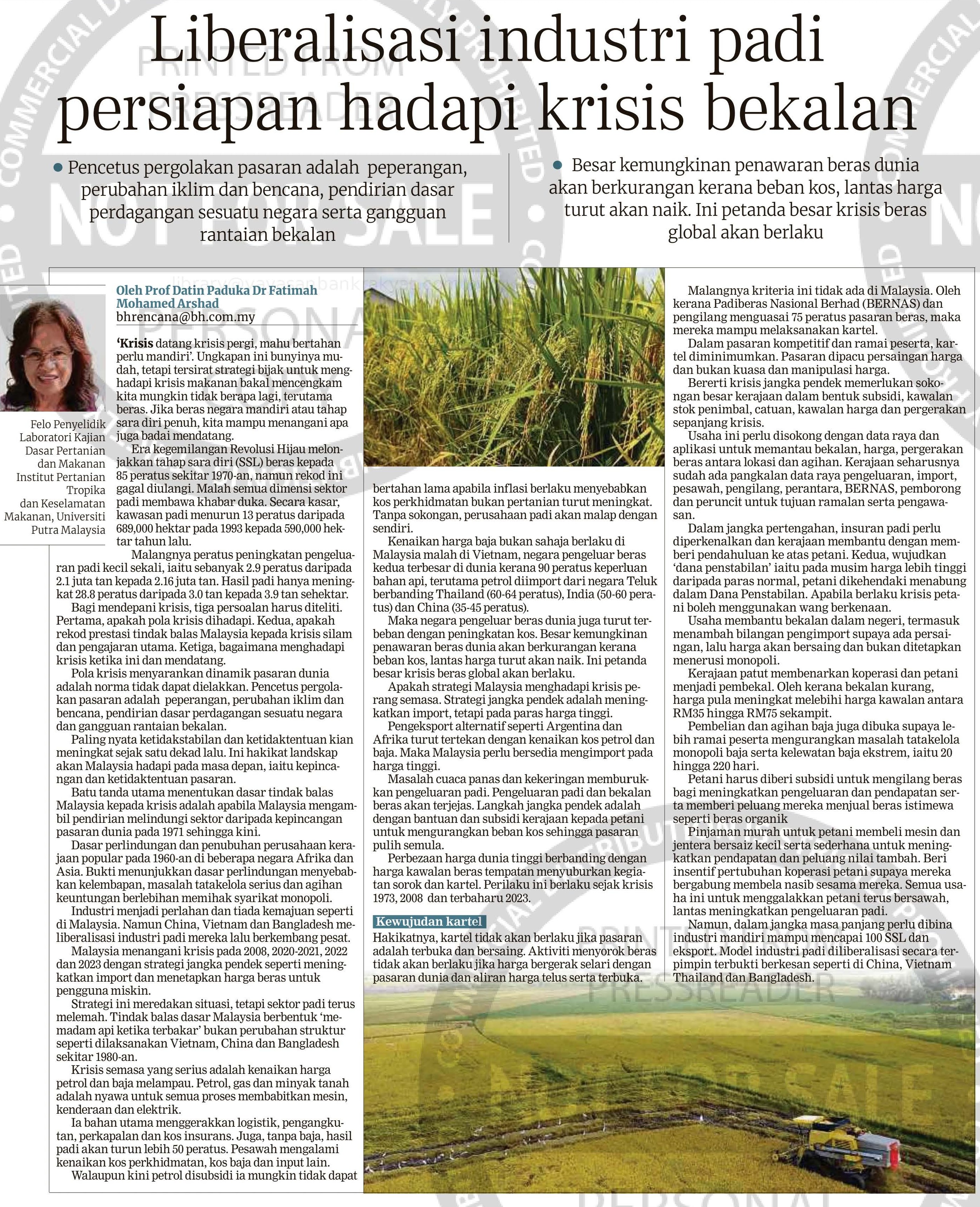 Prof Datin Paduka Dr Fatimah Mohamed Arshad (2026) Liberalisasi industri padi persiap hadapi krisis bekalan. Berita Harian. |