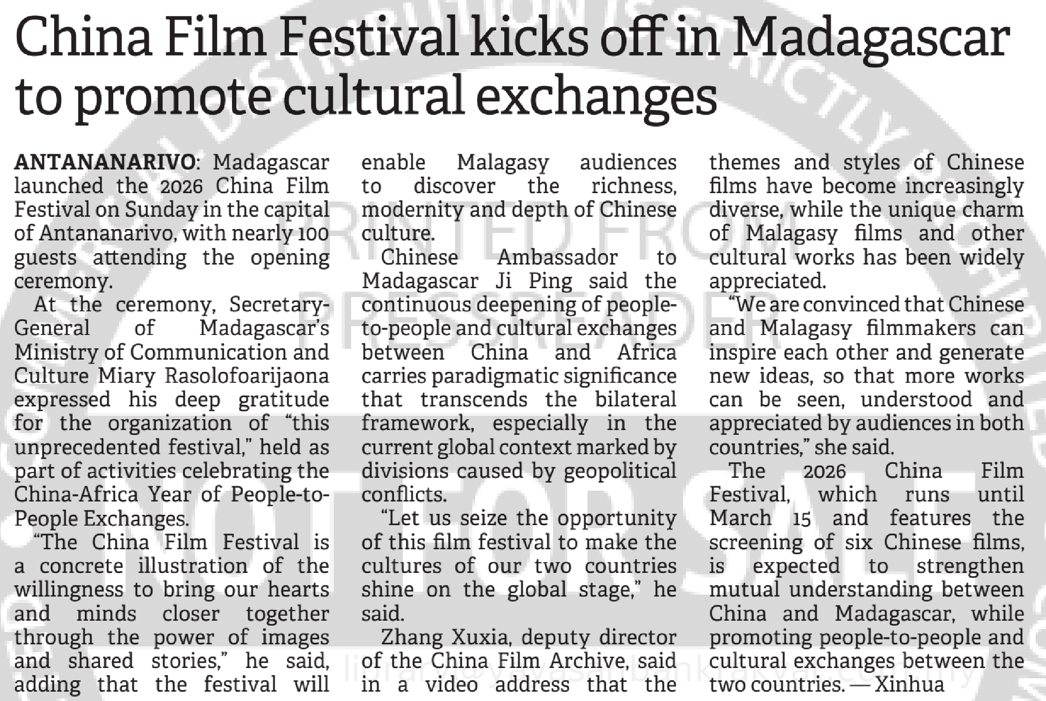 Xinhua (2026) China Film Festival kicks off in Madagascar to promote cultural exchanges. The Borneo Post(Sabah). |