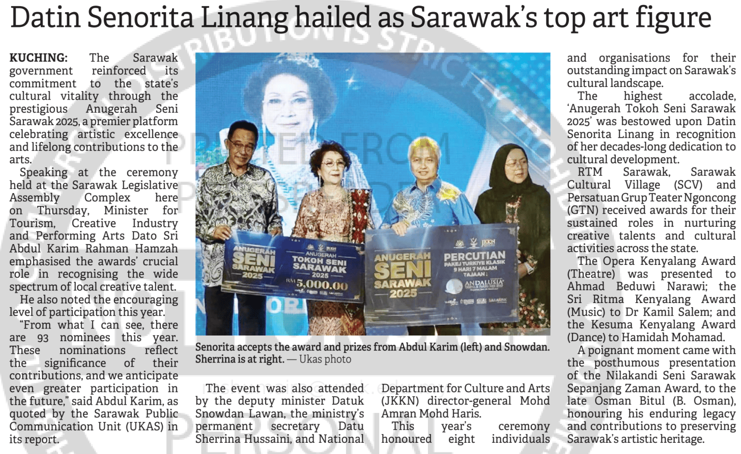 The Borneo Post (Sarawak) (2025) Datin Senorita Linang hailed as Sarawaks top art figure. The Borneo Post(Sarawak). |
