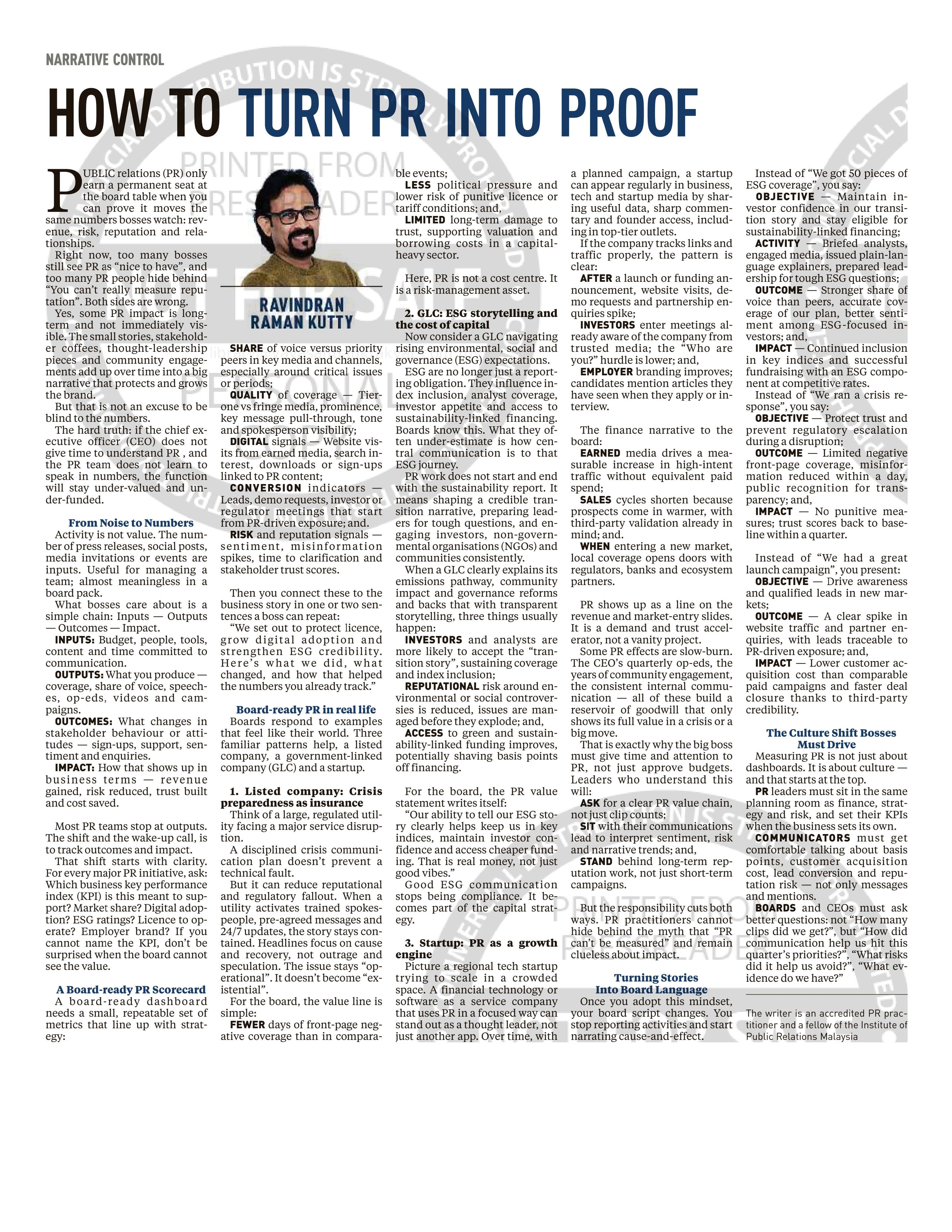 Ravindran Raman Kutty (2026) How To Turn PR Into Proof. New Straits Times. |