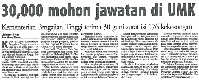 Berita Harian, Ismail Mat (2007) 30,000 mohon jawatan di UMK:Kementerian Pengajian Tinggi terima 30 guni surat isi 176 kekosongan. UNSPECIFIED. |