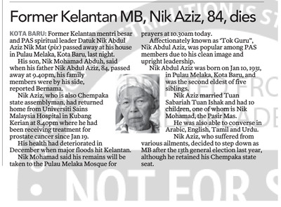 The Sun (Malaysia) (2015) Former Kelantan MB: Nik Aziz, 84, dies. The Sun (Malaysia). |