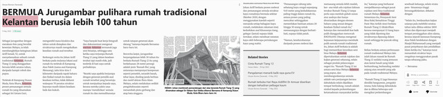 Bernama (2022) BERMULA Jurugambar pulihara rumah tradisional Kelantan berusia lebih 100 tahun. Utusan Borneo (Sarawak). |