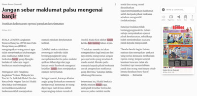 Hairul Nizam Baharin (2015) Jangan sebar maklumat palsu mengenai banjir. Utusan Borneo (Sarawak). |