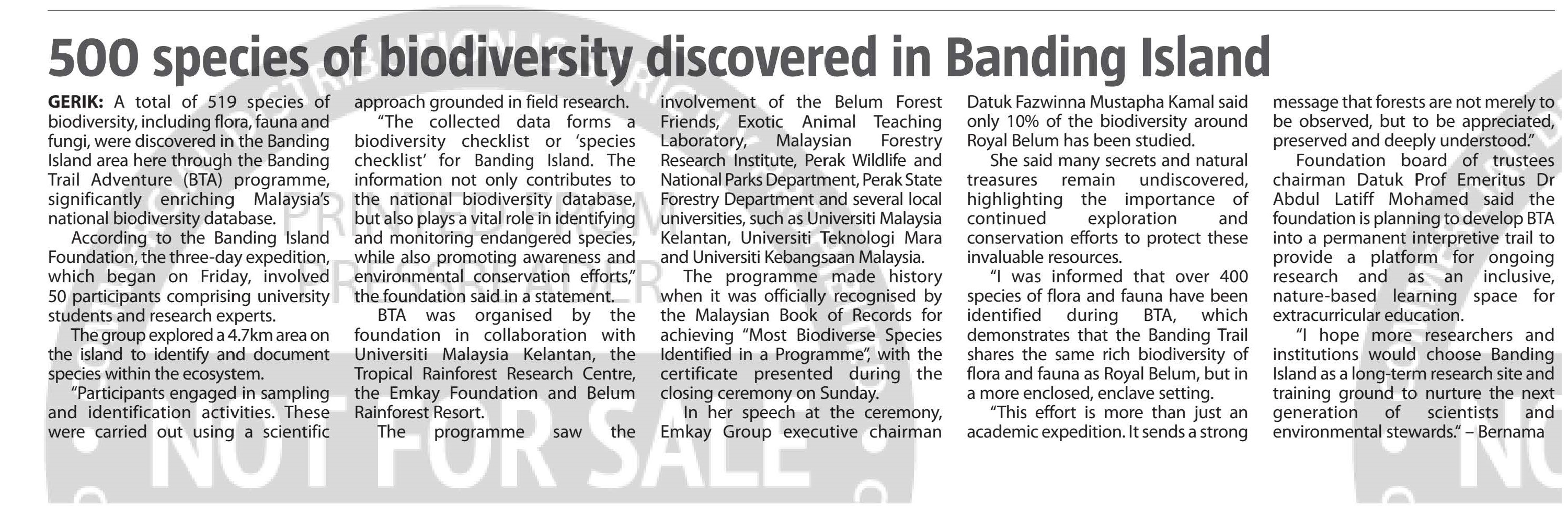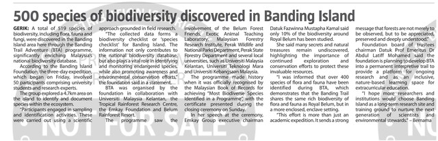 The Sun (Malaysia) (2025) 500 species of biodiversity discovered in Banding Island. The Sun (Malaysia). |