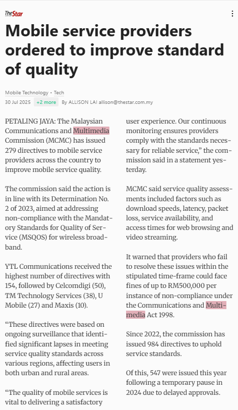 Lai, Allison Mobile service providers ordered to improve standard of quality. 2025. |