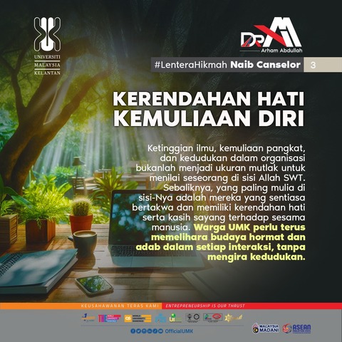 Kerendahan Hati Kemuliaan Diri Assalamualaikum Warahmatullahi Wabarakatuh, Salam Malaysia MADANI dan Salam Cintaku 1 Hati 1 Jiwa buat seluruh warga UMK sekalian. Pagi ini saya ingin menarik perhatian Tuan-Tuan dan Puan-Puan sejenak untuk sama-sama menghayati penulisan ini dan menjentik hati kita semua. Ketinggian ilmu, kemuliaan pangkat, dan kedudukan dalam organisasi bukanlah menjadi ukuran mutlak untuk menilai seseorang di sisi Allah SWT. Sebaliknya, yang paling mulia di sisi-Nya adalah mereka yang sentiasa bertakwa dan memiliki kerendahan hati serta kasih sayang terhadap sesama manusia. Sebagai sebuah institusi ilmu yang bertunjangkan kebitaraan akademik dan pembinaan sahsiah manusia, warga UMK harus secara berterusan memelihara budaya hormat-menghormati dan adab yang luhur dalam setiap interaksi, tanpa mengira kedudukan dan pangkat. Sikap merendah diri bukanlah tanda kelemahan, tetapi sebaliknya, ia cerminan kebijaksanaan seorang pemimpin dan insan yang berjiwa besar. Rasulullah SAW, seorang pemimpin agung yang disayangi umat, sentiasa menunjukkan teladan luar biasa dalam segala hal. Baginda tidak pernah mencela para sahabat, tidak menghina mereka dengan kata-kata kesat, apatah lagi menggunakan kedudukannya untuk menindas orang lain. Sebaliknya, Baginda sentiasa menyantuni sesiapa sahaja dengan penuh kasih sayang, kelembutan dan berhikmah. Sabda Rasulullah SAW : Jawatan yang kita sandang hari ini, sama ada sebagai Naib Canselor, Timbalan Naib Canselor, Pendaftar, Dekan, Pengarah atau mana-mana kedudukan dalam hierarki Universiti, hanyalah amanah sementara yang perlu ditanggung dan perlu dijawab di hadapan Allah kelak. Bekalan perjalanan kehidupan bukan terletak pada kebesaran nama atau kedudukan, tetapi pada amalan soleh yang ikhlas dalam setiap perbuatan kita. Kemuliaan seseorang tidak bergantung pada pangkat, sebaliknya pada keikhlasan dalam menunaikan amanah, integriti dalam melaksanakan tanggungjawab, serta kemampuan menjaga maruah diri dan orang lain. Ungkapan kata Inggeris ada menyebut “Nothing in life is permanent, be humble". Ungkapan ini memberi satu peringatan kepada kita bahawa segala sesuatu dalam kehidupan ini bersifat sementara. Keadaan, kejayaan, atau kesulitan yang kita alami tidak akan bertahan selama-lamanya. Oleh itu, kita disarankan untuk bersikap rendah hati dan tidak bermegah dengan apa yang kita miliki, kerana semuanya boleh berubah. Kesederhanaan dan rasa syukur dalam menghadapi kehidupan adalah penting. Justeru, saya mengajak diri saya dan seluruh warga kerja UMK, marilah kita sama-sama wujudkan suasana kerja yang harmoni, beradab, dan penuh dengan rasa hormat sesama kita. Tanggalkan ego yang berlebihan, hindari tutur kata yang melukakan hati, dan hiasilah diri dengan kelembutan serta kebijaksanaan dalam berbicara. Insya-Allah, dengan pembudayaan sikap ini, kita bukan sahaja membentuk suasana kerja yang lebih positif tetapi juga memperoleh keberkatan dan keredhaan Allah SWT dalam setiap perkara yang kita lakukan. Sekian, terima kasih. Ikhlas daripada ; Arham Abdullah |