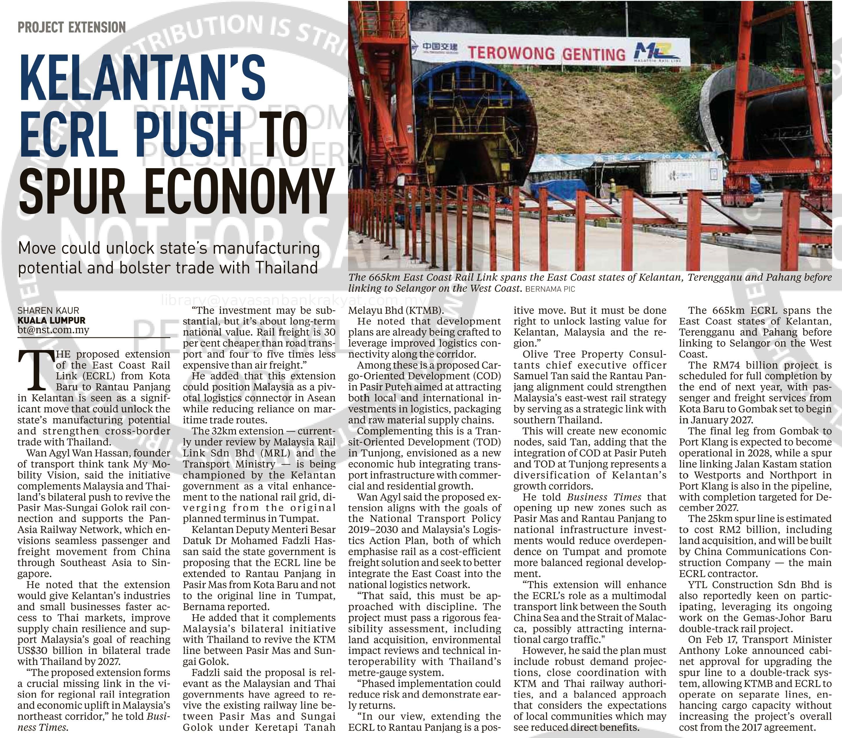 Sharen Kaur (2025) KELANTAN’S ECRL PUSH TO SPUR ECONOMY. New Straits Times. |