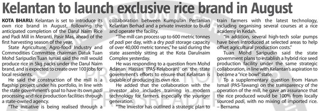 The Sun Malaysia (2025) Kelantan to launch exclusive rice brand in August. The Sun (Malaysia). |