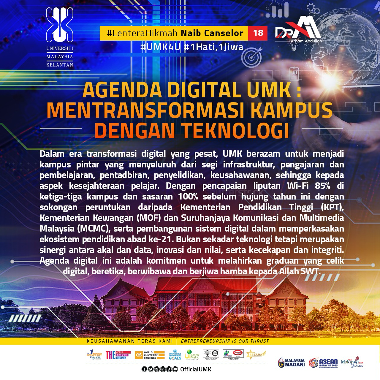 AGENDA DIGITAL UMK : MENTRANSFORMASI KAMPUS DENGAN TEKNOLOGI Assalamualaikum Warahmatullahi Wabarakatuh, Salam Malaysia MADANI dan Salam UMK4U, 1 Hati 1 Jiwa kepada seluruh warga Universiti Malaysia Kelantan (UMK) yang saya muliakan. Dalam era yang terus bergerak pantas ini, kita sedang menyaksikan satu anjakan paradigma besar-besaran daripada dunia analog kepada ekosistem digital yang dinamik dan inklusif. Dalam realiti semasa, mereka yang tidak mampu beradaptasi akan tertinggal jauh di belakang, manakala mereka yang berani mendepani arus teknologi akan menjadi peneraju utama perubahan. Justeru, UMK harus bersedia sepenuhnya untuk membentuk ekosistem kampus yang benar-benar digital iaitu sebuah kampus pintar yang bukan sahaja cekap dan inovatif, malah menyeluruh dari segi infostruktur, infrastruktur, pengajaran dan pembelajaran, pentadbiran, penyelidikan, keusahawanan, sehingga kepada aspek kesejahteraan pelajar. Transformasi digital bukan lagi sekadar pilihan malah keperluan strategik yang tidak boleh diabaikan. Dalam usaha menjayakan agenda ini, langkah pertama yang telah kita lakukan ialah memastikan seluruh kampus di UMK dilengkapi dengan liputan Wi-Fi dan rangkaian selular pada tahap yang optimum. Sehingga kini, pencapaian liputan wifi di ketiga-tiga kampus utama kita telah mencapai paras 85%, dan sasaran untuk melengkapkan baki 15% sebelum hujung tahun ini sedang dalam proses penyiapan. Dengan sokongan peruntukan daripada Kementerian Pendidikan Tinggi (KPT), Kementerian Kewangan (MOF) dan Suruhanjaya Komunikasi dan Multimedia Malaysia (MCMC), saya yakin dan optimis bahawa matlamat ini pasti tercapai. Selain itu, kita juga akan melakukan penilaian menyeluruh terhadap sistem digital sedia ada, terutamanya yang berkaitan dengan proses pengajaran dan pembelajaran, demi memastikan kesesuaian dan keberkesanan operasinya dalam menyokong pendidikan abad ke-21. Di dalam bidang automasi pentadbiran pula, UMK menerusi Pusat Komputeran dan Informatik (CCI) telah mencatatkan beberapa kejayaan signifikan. Antaranya ialah pembangunan dua sistem utama iaitu Sistem Pengurusan Perbelanjaan Jabatan & Universiti (eVot ) dan Sistem Pengurusan Latihan Staf (eTraining ). Selain itu, Sistem Permohonan Kemasukan Bersepadu juga telah berjaya diperkenalkan sebagai sebahagian daripada inisiatif pendigitalan. Agenda digital yang ingin kita capai ini bukan sekadar soal teknologi, tetapi merupakan sinergi antara akal dan data, inovasi dan nilai, serta kecekapan dan integriti. Dengan sokongan infrastruktur dan infostruktur yang kukuh, sistem yang sentiasa dikemaskini, serta budaya organisasi yang fleksibel dan berorientasikan perubahan, saya yakin UMK akan muncul sebagai sebuah kampus pintar yang tidak hanya melahirkan graduan celik teknologi, tetapi juga insan yang beretika, berwibawa, dan berjiwa hamba kepada Allah SWT. Sekian, terima kasih. Ikhlas daripada; |