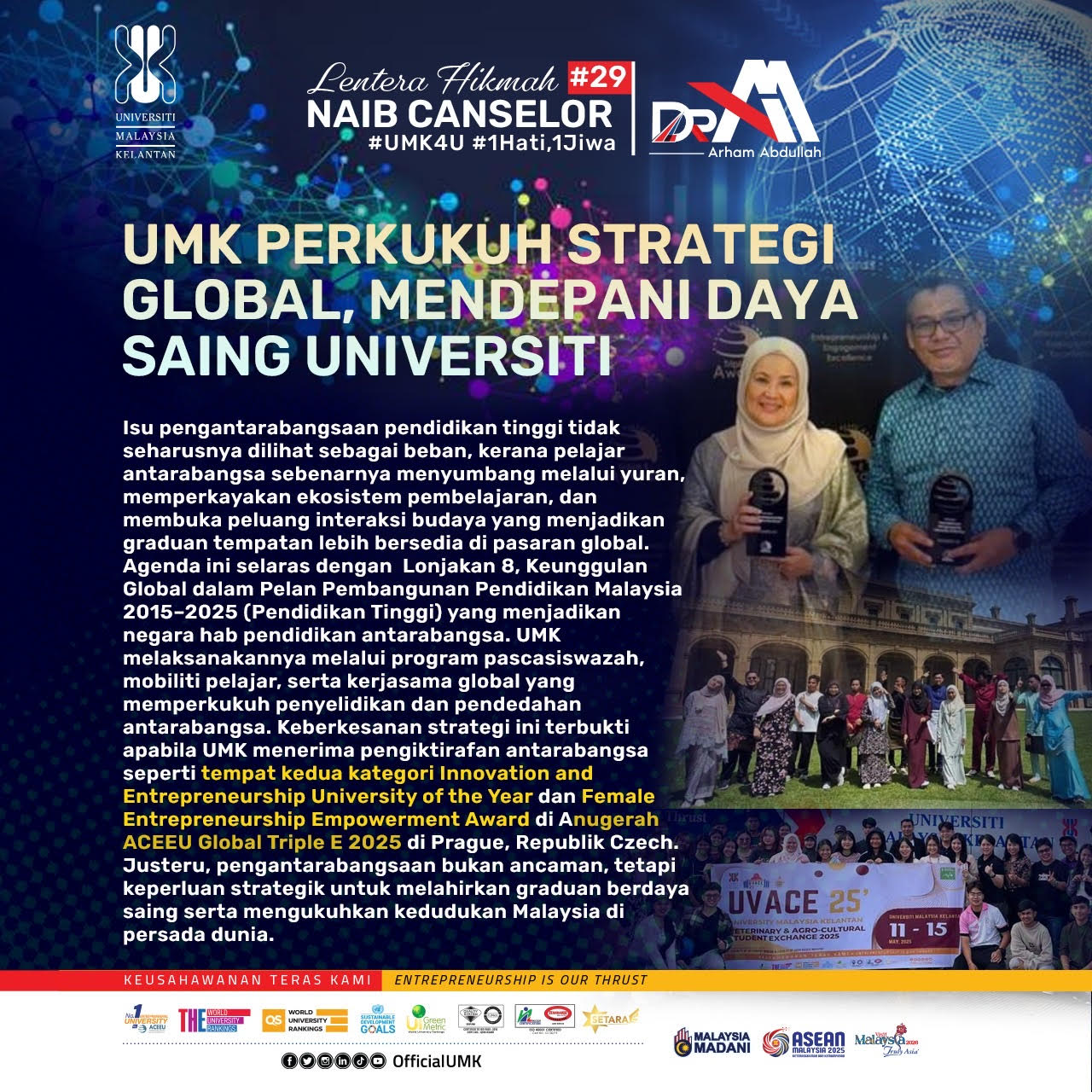 UMK Perkukuh Strategi Global, Mendepani Daya Saing Universiti Assalamualaikum Warahmatullahi Wabarakatuh, Salam Malaysia MADANI dan Salam UMK4U 1 Hati 1 Jiwa kepada seluruh warga UMK yang saya kasihi. Isu pengantarabangsaan pendidikan tinggi sering menjadi polemik, ada yang melihatnya sebagai peluang global, sementara yang lain skeptikal dan mempolitikkan isu ini oleh pihak-pihak yang berkepentingan. Hakikatnya, pelajar antarabangsa bukan beban fiskal kerana mereka membayar yuran lebih tinggi berbanding pelajar tempatan. Kehadiran mereka menambah pendapatan universiti, memperkaya ekosistem pembelajaran, membuka ruang interaksi budaya dan secara langsung menyediakan graduan tempatan lebih bersedia menghadapi pasaran kerja global. Nilai tambah seperti ini tidak akan wujud jika universiti kekal tertutup hanya kepada komuniti tempatan. Lebih daripada itu, suara sinis yang mengaitkan kemasukan pelajar antarabangsa dengan beban cukai rakyat adalah tidak berasas. Agenda pengantarabangsaan di bawah Lonjakan 8, Keunggulan Global merupakan strategi negara yang telah digariskan dalam Pelan Pembangunan Pendidikan Malaysia 2015–2025 (Pendidikan Tinggi) dengan aspirasi menjadikan Malaysia hab pendidikan antarabangsa. Universiti awam termasuk UMK wajar menyahut agenda ini sebagai tanggungjawab nasional. Seiring dengan itu, UMK turut memberi tumpuan khusus kepada program pascasiswazah dan inisiatif program mobiliti sebagai tonggak utama strategi pengantarabangsaan. Melalui kerjasama global, UMK membuka peluang kepada pelajar antarabangsa mengikuti pengajian di peringkat sarjana dan kedoktoran, sekali gus memperkukuh bidang penyelidikan yang bersifat rentas negara. Pada masa sama, pelajar UMK turut digalakkan menyertai program pertukaran, latihan industri dan penyelidikan bersama universiti luar negara agar mereka memperoleh pendedahan dan pengalaman antarabangsa yang signifikan. Usaha ini memastikan graduan UMK bukan sahaja berdaya saing dalam konteks tempatan, tetapi juga relevan di persada dunia. Keberkesanan strategi global ini telah membuktikan bahawa apabila UMK meraih tempat kedua dalam kategori Innovation and Entrepreneurship University of the Year dan Female Entrepreneurship Empowerment Award di Anugerah ACEEU Global Triple E 2025 di Prague, Republik Czech baru-baru ini. Pengiktirafan ini secara langsung telah meletakkan UMK pada kelas dunia, meneguhkan kedudukan sebagai peneraju universiti keusahawanan dengan agenda pengantarabangsaan yang jelas dan berimpak tinggi. Jelas bahawa, program pengantarabangsaan ini telah mencorak dalam peningkatan reputasi global, membina jaringan strategik, serta mengukuhkan martabat negara di pentas dunia. Justeru, universiti awam tidak boleh terperangkap dalam kepompong tempatan. Graduan mesti dibentuk dalam ekosistem antarabangsa agar terus relevan dan berdaya saing. UMK memilih untuk berani menembusi sempadan demi memastikan universiti ini terus dihormati sebagai pusat kecemerlangan ilmu dalam negara khususnya. Oleh itu, pengantarabangsaan bukan sekadar pilihan tetapi keperluan strategik untuk masa depan pendidikan tinggi negara. Ia sama sekali bukan ancaman terhadap hak anak bangsa, sebaliknya peluang memperkasa pelajar tempatan dengan pendedahan, jaringan dan pengalaman global yang bernilai. Dengan keberanian melangkah keluar dari kepompong tempatan, UMK bukan sahaja melahirkan graduan berkualiti tinggi, malah turut mengukuhkan kedudukan Malaysia sebagai hab pendidikan antarabangsa yang disegani di persada dunia. Ikhlas daripada, Arham bin Abdullah |