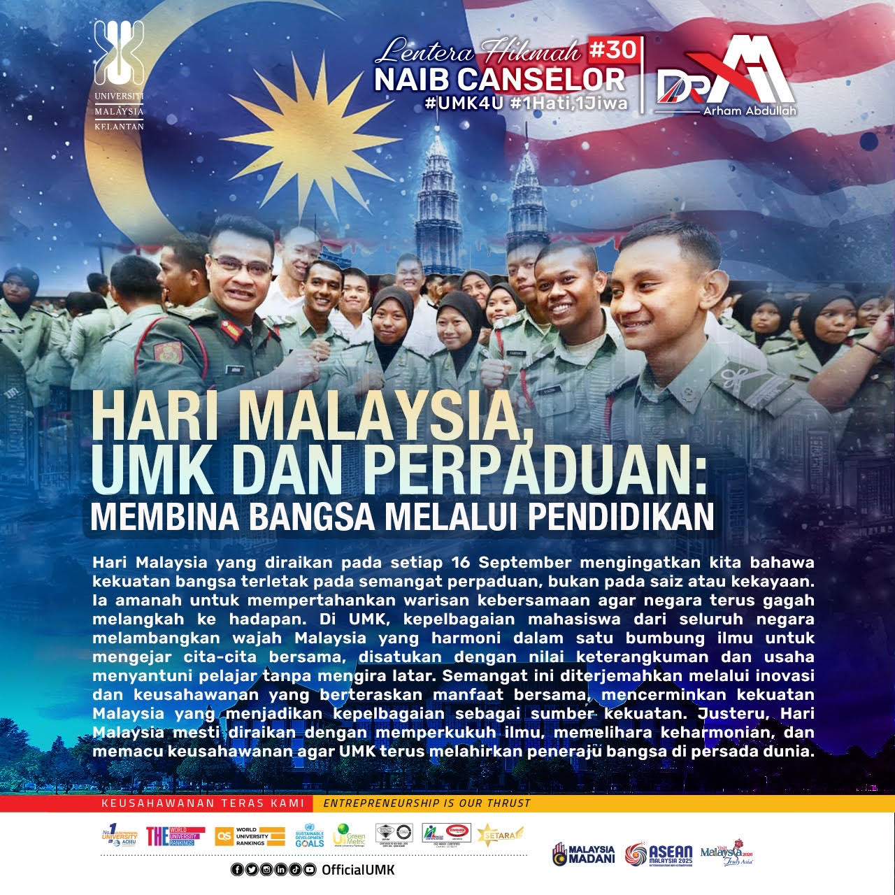 Hari Malaysia, UMK dan Perpaduan : Membina Bangsa Melalui Pendidikan Assalamualaikum Warahmatullahi Wabarakatuh, Salam Malaysia MADANI dan Salam UMK4U 1 Hati 1 Jiwa kepada seluruh warga UMK yang saya kasihi. Hari Malaysia yang diraikan pada setiap 16 September mengingatkan saya bahawa kekuatan bangsa tidak bergantung pada saiz atau kekayaan, tetapi pada semangat perpaduan yang membina asas negara. Malaysia lahir daripada kebijaksanaan generasi terdahulu yang berjaya menyatukan kepelbagaian kaum, budaya dan agama untuk membentuk sebuah persekutuan yang harmoni. Firman Allah SWT dalam Surah Ali Imran, Ayat 103 menegaskan: “Dan berpeganglah kamu semua kepada tali (agama) Allah, dan janganlah kamu bercerai-berai. Ingatlah akan nikmat Allah kepadamu ketika kamu dahulu bermusuhan, lalu Allah mempersatukan hati-hati kamu, sehingga dengan nikmat-Nya kamu menjadi bersaudara.” Ayat ini adalah peringatan bahawa perpaduan ialah nikmat yang wajib dipelihara. Bukankah tanpa perpaduan, semua pencapaian yang kita banggakan hari ini akan goyah? Maka Hari Malaysia harus dilihat sebagai amanah untuk mempertahankan warisan kebersamaan demi masa depan negara. Di UMK, saya melihat wajah Malaysia setiap hari. Mahasiswa dari Sabah, Sarawak dan Semenanjung hadir dengan latar budaya, dialek dan pengalaman yang berbeza, namun mereka bersatu di bawah satu bumbung ilmu untuk mengejar cita-cita bersama. UMK adalah salah satu gambaran Malaysia yang harmoni dalam kepelbagaian, tempat lahirnya pemimpin masa depan yang diasuh dengan nilai perpaduan. Saya juga percaya universiti mesti menekankan prinsip keterangkuman melalui pelbagai inisiatif bagi memastikan tiada pelajar tercicir hanya kerana kekurangan. Apakah erti sebuah universiti jika ada anak bangsa yang terhalang daripada menuntut ilmu hanya kerana kesempitan hidup? Inilah sebabnya usaha menyantuni pelajar B40 dan asnaf terus diperkasa di UMK. Dalam kerangka universiti keusahawanan, semangat Hari Malaysia turut terserlah. Mahasiswa bergabung idea dan kepakaran untuk melahirkan inovasi baharu. Mereka belajar bahawa keusahawanan tidak terhad kepada keuntungan semata-mata, tetapi juga tentang mencipta peluang bersama, membina jaringan dan memberi manfaat kepada masyarakat. Tidakkah ini mencerminkan semangat Malaysia yang menjadikan kepelbagaian sebagai kekuatan? Akhir kata, saya menyeru seluruh warga UMK agar menjadikan Hari Malaysia sebagai amanah bersama. Perkukuh ilmu. Pelihara keharmonian. Pacu semangat keusahawanan. Saya yakin dengan tiga kekuatan ini, UMK akan terus melahirkan peneraju bangsa dan Malaysia akan terus melangkah gagah di persada dunia. Ikhlas daripada, Arham bin Abdullah |