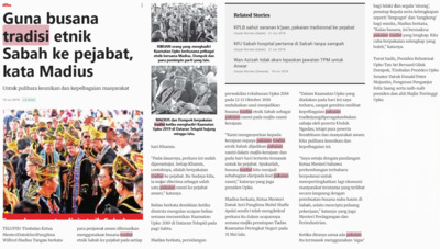 Utusan Borneo (Sabah) (2019) Guna busana tradisi etnik Sabah ke pejabat, kata Madius Untuk pulihara keunikan dan kepelbagaian masyarakat. UNSPECIFIED. |