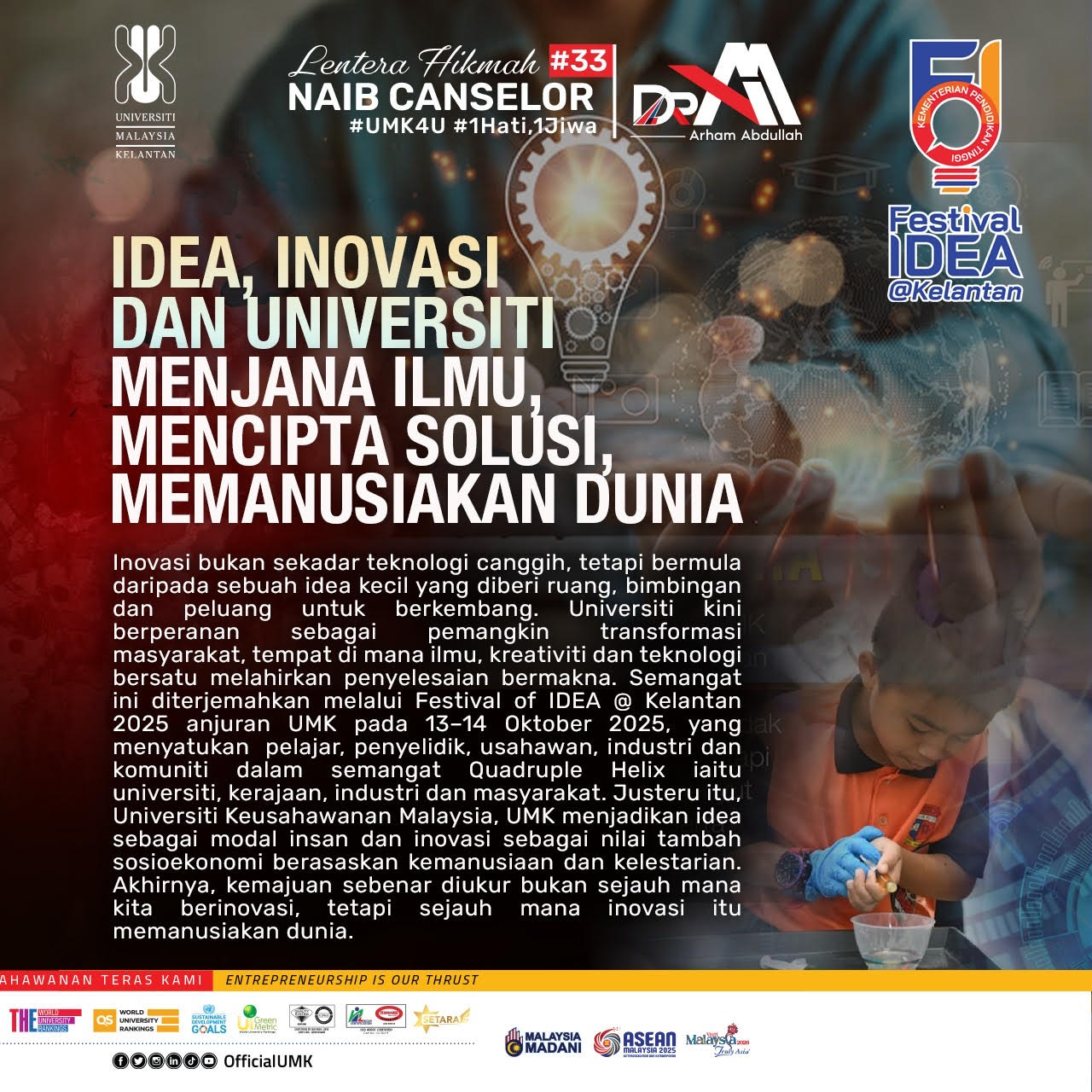 Idea, Inovasi dan Universiti: Menjana Ilmu, Mencipta Solusi, Memanusiakan Dunia Assalamualaikum Warahmatullahi Wabarakatuh, Salam Malaysia MADANI dan Salam UMK4U 1 Hati 1 Jiwa. Warga UMK yang saya hormati, Bidang penyelidikan dan inovasi amat sinonim dengan institusi pengajian tinggi. Apabila kita berbicara tentang inovasi, ia sering dikaitkan dengan teknologi canggih atau penyelidikan kompleks. Namun hakikatnya, inovasi bermula dengan sesuatu yang paling asas, iaitu sebuah idea. Saya percaya setiap perubahan besar bermula dengan sesuatu yang kecil. Idea hadir dalam pelbagai bentuk seperti ketika kita kekurangan sumber, berdepan cabaran, berbincang secara santai atau terdorong oleh semangat untuk berbakti kepada masyarakat. Apabila idea diberi ruang, bimbingan dan peluang, ia mampu berkembang menjadi inovasi yang membawa makna kepada kehidupan seharian. Pada pengamatan saya, peranan universiti kini melangkaui fungsi akademik. Universiti menjadi penggerak kepada transformasi masyarakat dan tempat di mana ilmu, kreativiti serta teknologi bersinergi untuk melahirkan penyelesaian yang bermakna. Inilah semangat yang ingin kita suburkan melalui Festival of IDEA @ Kelantan 2025 yang akan berlangsung di Universiti Malaysia Kelantan (UMK) pada 13 hingga 14 Oktober ini. Saya berbangga dengan inisiatif warga UMK melalui Pejabat Timbalan Naib Canselor (Penyelidikan dan Inovasi) yang proaktif menyahut seruan Kementerian Pendidikan Tinggi (KPT) untuk memperluas gerakan Festival of Idea (FOI) ke seluruh negara. Program ini membawa makna yang jauh lebih besar daripada sekadar pameran atau perhimpunan ilmiah, kerana ia membina satu ekosistem pembelajaran terbuka yang menghubungkan pelajar, penyelidik, usahawan, industri dan komuniti dalam semangat Quadruple Helix iaitu universiti, kerajaan, industri dan masyarakat. Sebagai Universiti Keusahawanan Malaysia, UMK berperanan menjadikan idea sebagai modal insan dan inovasi sebagai nilai tambah kepada pembangunan sosioekonomi. Inovasi di UMK tidak hanya tertumpu pada penciptaan teknologi, tetapi berteraskan manusia dengan memahami denyut nadi masyarakat, menilai realiti setempat serta membina solusi yang lestari dan inklusif. Saya menyeru seluruh warga universiti, rakan industri, agensi kerajaan dan komuniti untuk bersama menjayakan agenda ini. Jadikan Festival of IDEA @ Kelantan 2025 sebagai medan untuk menyalakan semula semangat ilmu dan memperkukuh budaya inovasi yang berakar pada nilai serta kemanusiaan. Kerana pada akhirnya, kemajuan bukan diukur sejauh mana kita berinovasi, tetapi sejauh mana inovasi itu memanusiakan dunia. Ikhlas, |