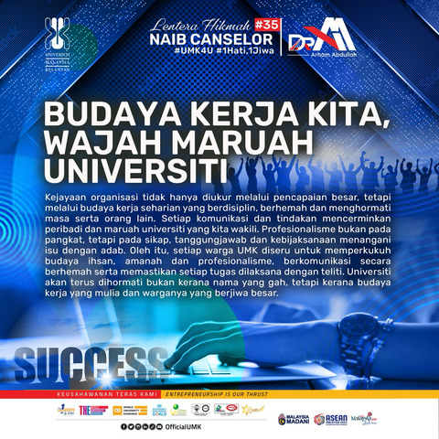 Budaya Kerja Kita, Wajah Maruah Universiti Assalamualaikum Warahmatullahi Wabarakatuh, Salam Malaysia MADANI dan Salam UMK4U 1 Hati 1 Jiwa. Warga UMK yang saya hormati, Kejayaan sesebuah organisasi tidak hanya diukur daripada pencapaian besar yang dicapai, tetapi juga daripada budaya kerja seharian yang diamalkan. Cara kita berkomunikasi, berurusan dan menghormati masa orang lain mencerminkan peribadi kita serta maruah universiti yang kita wakili. Saya percaya masih ada ruang untuk kita bersama-sama memperkukuh amalan kerja agar lebih berhemah, tepat dan berkesan. Dalam kesibukan tugasan, ada kalanya kita terlepas menepati masa, menyerahkan dokumen tanpa semakan rapi atau lewat memberi maklum balas terhadap mesej rasmi. Perkara kecil ini nampak remeh, tetapi memberi kesan besar kepada kepercayaan dan imej profesional universiti. Profesionalisme tidak hanya pada pangkat atau gelaran, tetapi terbias daripada disiplin dan tanggungjawab. Setiap komunikasi yang kita sampaikan menggambarkan siapa kita serta bagaimana kita menghormati orang lain. Jika sesuatu isu dirasakan sensitif, tangani dengan kebijaksanaan dan beradab. Kata-kata yang sopan mampu meredakan keadaan dan memupuk hubungan kerja yang harmoni. Saya juga ingin menggalakkan semua warga UMK untuk berbincang secara berhemah dan berhikmah apabila memerlukan penjelasan lanjut. Dapatkan pandangan daripada ketua jabatan, penyelia atau rakan sekerja yang memahami konteks dasar universiti. Semakan dan perbincangan yang dibuat secara tertib akan menghasilkan keputusan lebih matang serta memperkukuh kredibiliti organisasi kita. Marilah kita bersama-sama memupuk budaya kerja berasaskan ihsan, amanah dan profesionalisme. Kelak, Universiti ini akan terus dihormati bukan kerana gahnya nama, tetapi kerana budayanya yang mulia dan warganya yang berjiwa besar. Apabila kita bekerja dengan hati yang ikhlas dan niat yang baik, hasilnya bukan sahaja kejayaan, tetapi juga keberkatan yang mengiringi setiap usaha kita. Sekian, terima kasih. Ikhlas daripada, |