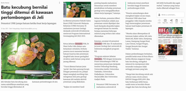 Hidayatidayu Razali (2021) Batu kecubung bernilai tinggi ditemui di kawasan perlombongan di Jeli. Berita Harian. |
