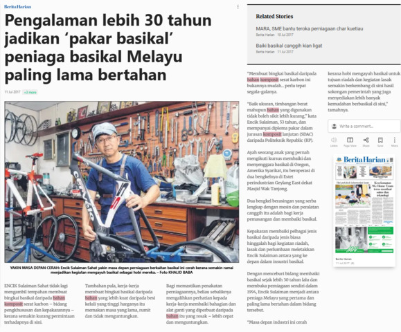 Bernama (2017) Pengalaman lebih 30 tahun jadikan ‘pakar basikal’ peniaga basikal Melayu paling lama bertahan. Berita Harian. |
