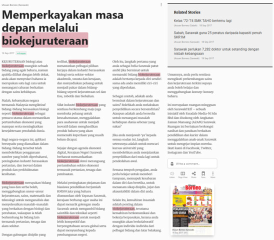 Bernama (2017) Memperkayakan masa depan melalui biokejuruteraan. Utusan Borneo (Sarawak). |