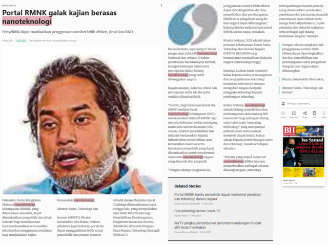 Rafidah Mat Ruzki (2021) Portal RMNK galak kajian berasas nanoteknologi. Berita Harian. |
