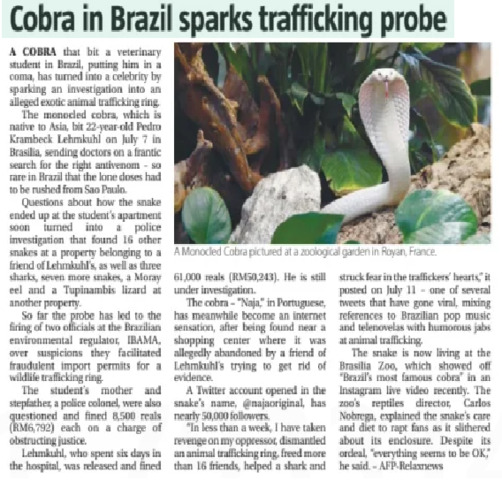 AFP (2020) Cobra in Brazil sparks trafficking probe. The Star Malaysia. |