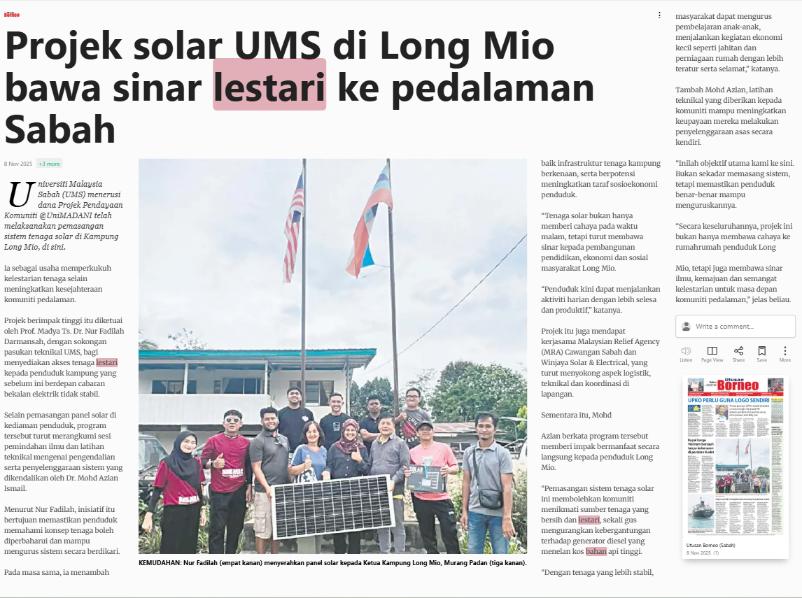 Bernama (2025) Projek solar UMS di Long Mio bawa sinar lestari ke pedalaman Sabah. Utusan Borneo (Sabah). |