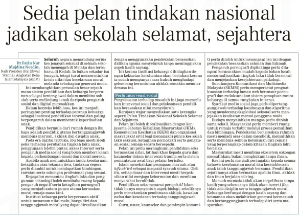 Dr. Fatin Majdina Nordin (2025) Sedia pelan tindakan nasional jadikan sekolah selamat,sejahtera. Berita Harian. |