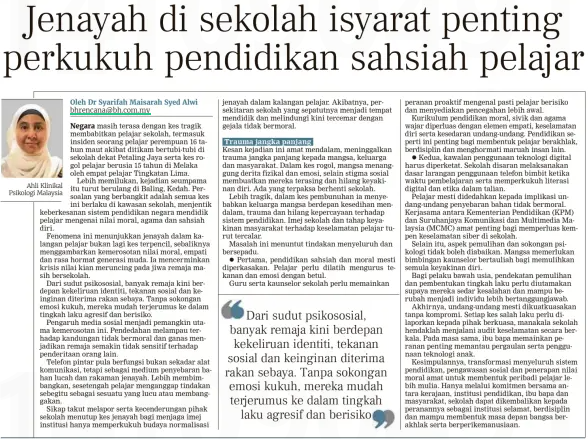 Dr. Syarifah Maisarah Syed Alwi (2025) Jenayah di sekolah isyarat penting perkukuh pendidikan sahsiah pelajar. Berita Harian. |