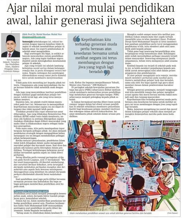 Prof. Dr. Mohd Roslan Mohd Nor (2025) Ajar nilai moral mulai pendidikan awal, lahir generasi jiwa sejahtera. Berita Harian. |