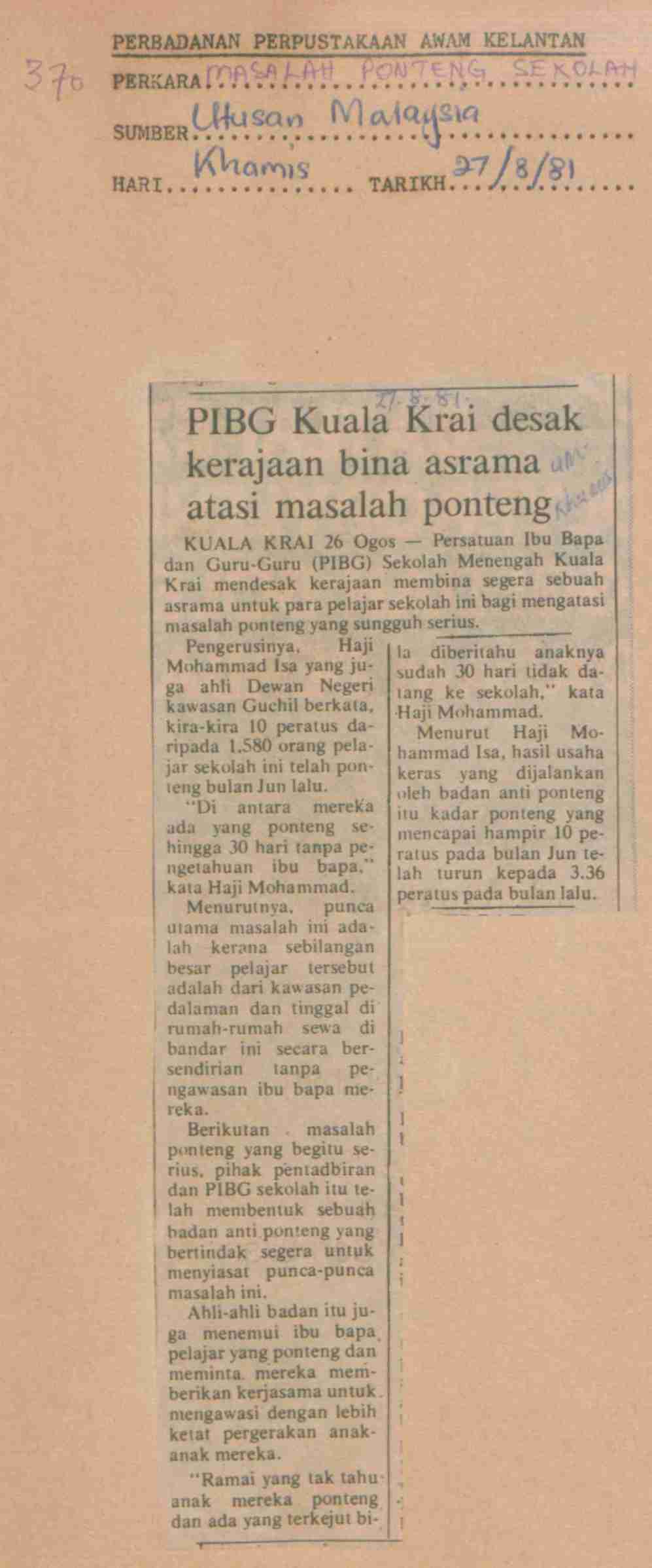Utusan Malaysia (1981) PIBG Kuala Krai desak kerajaan bina asrama atasi masalah ponteng. Utusan Malaysia. |