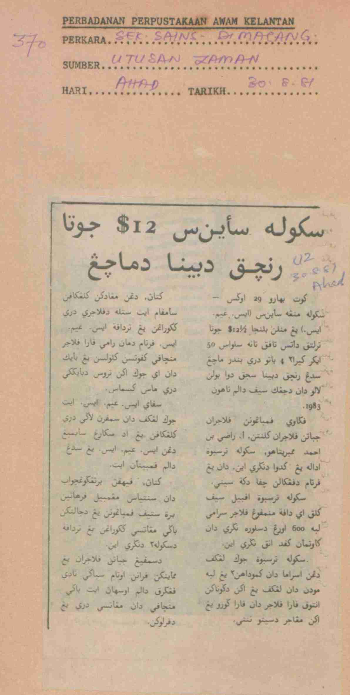 Utusan Zaman (1981) Sekolah Sains $12juta dirancang dibina di Machang. Utusan Zaman. |