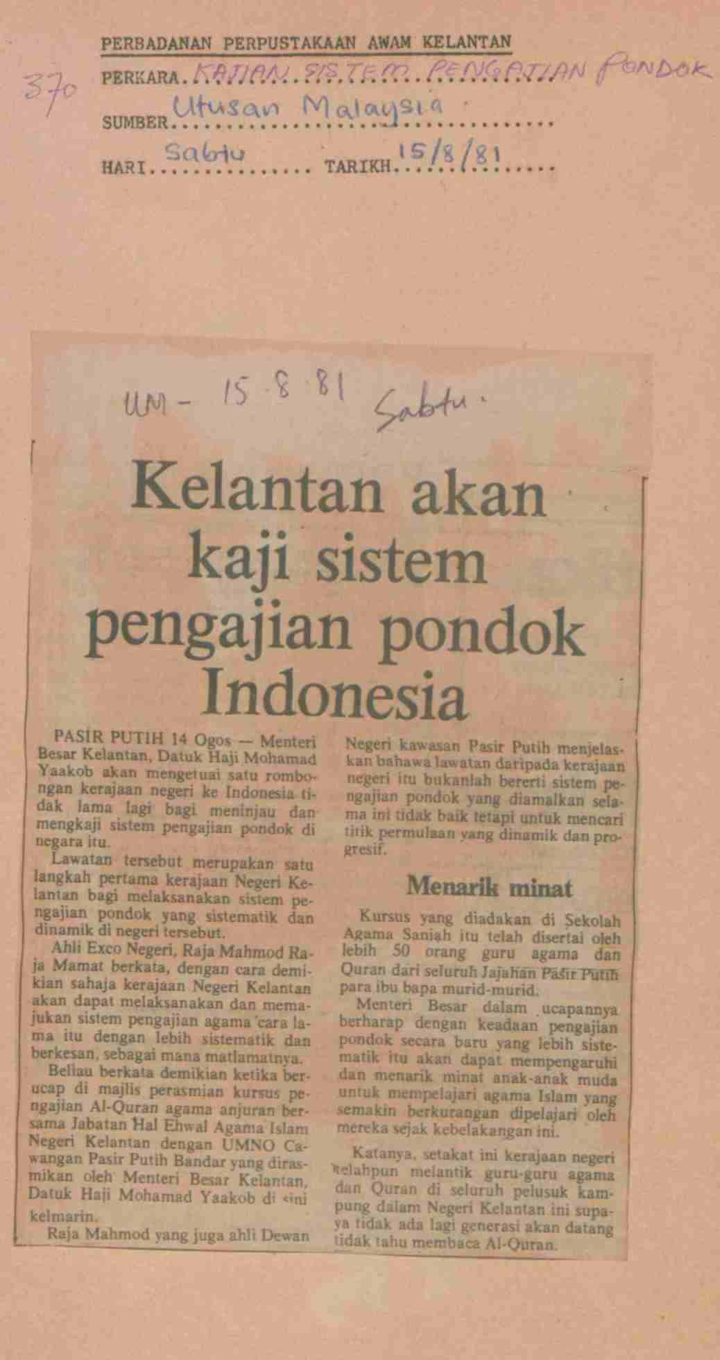 Utusan Malaysia (1981) Kelantan akan kaji sistem pengajian pondok Indonesia. Utusan Malaysia. |