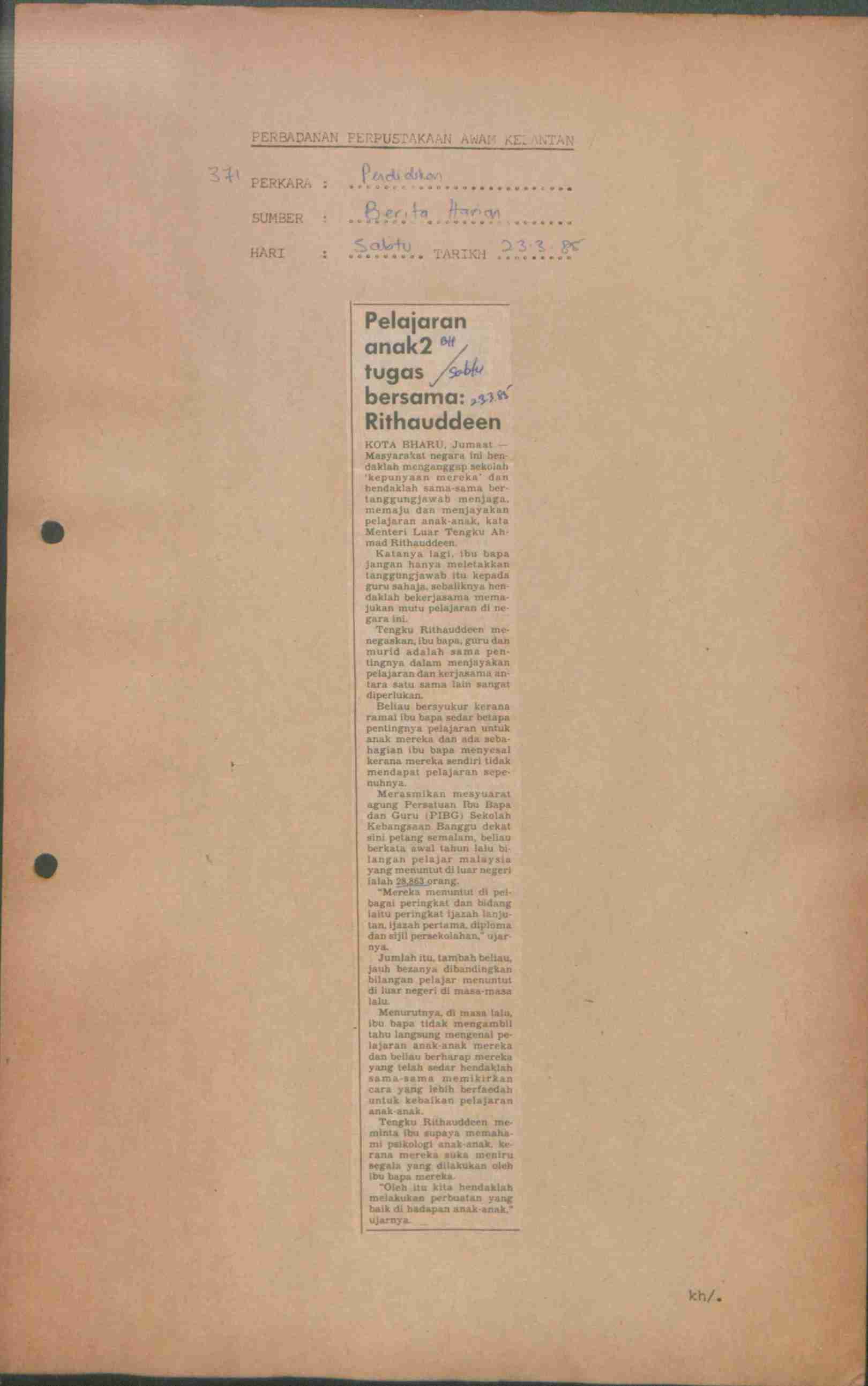 Berita Harian (1985) Pelajaran anak2 tugas bersama : Rithauddeen. Berita Harian. |