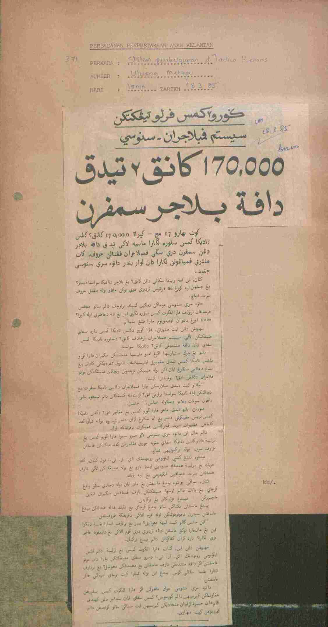 Utusan Melayu (1985) Guru-guru kemas perlu tingkatkan sistem pembelajaran- Sanusi. 170,000 kanak2 tidak dapat belajar sempurna. Utusan Melayu. |