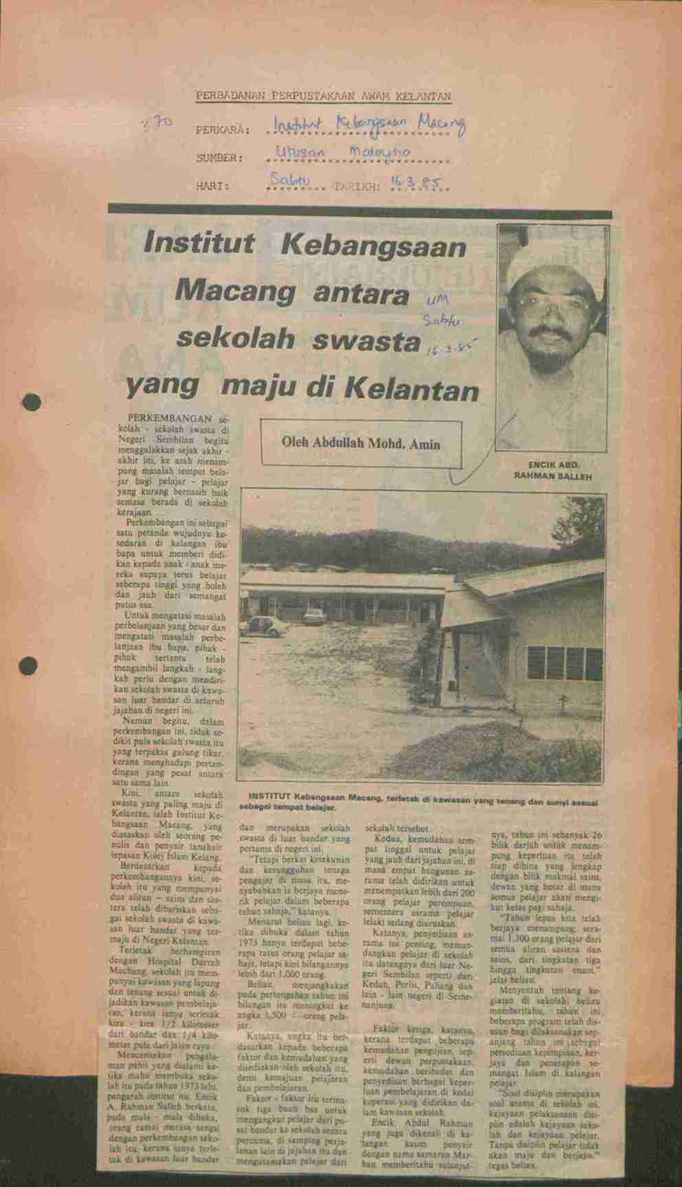 Utusan Malaysia (1985) Institut Kebangsaan Macang antara sekolah swasta yang maju di Kelantan. Utusan Malaysia. |