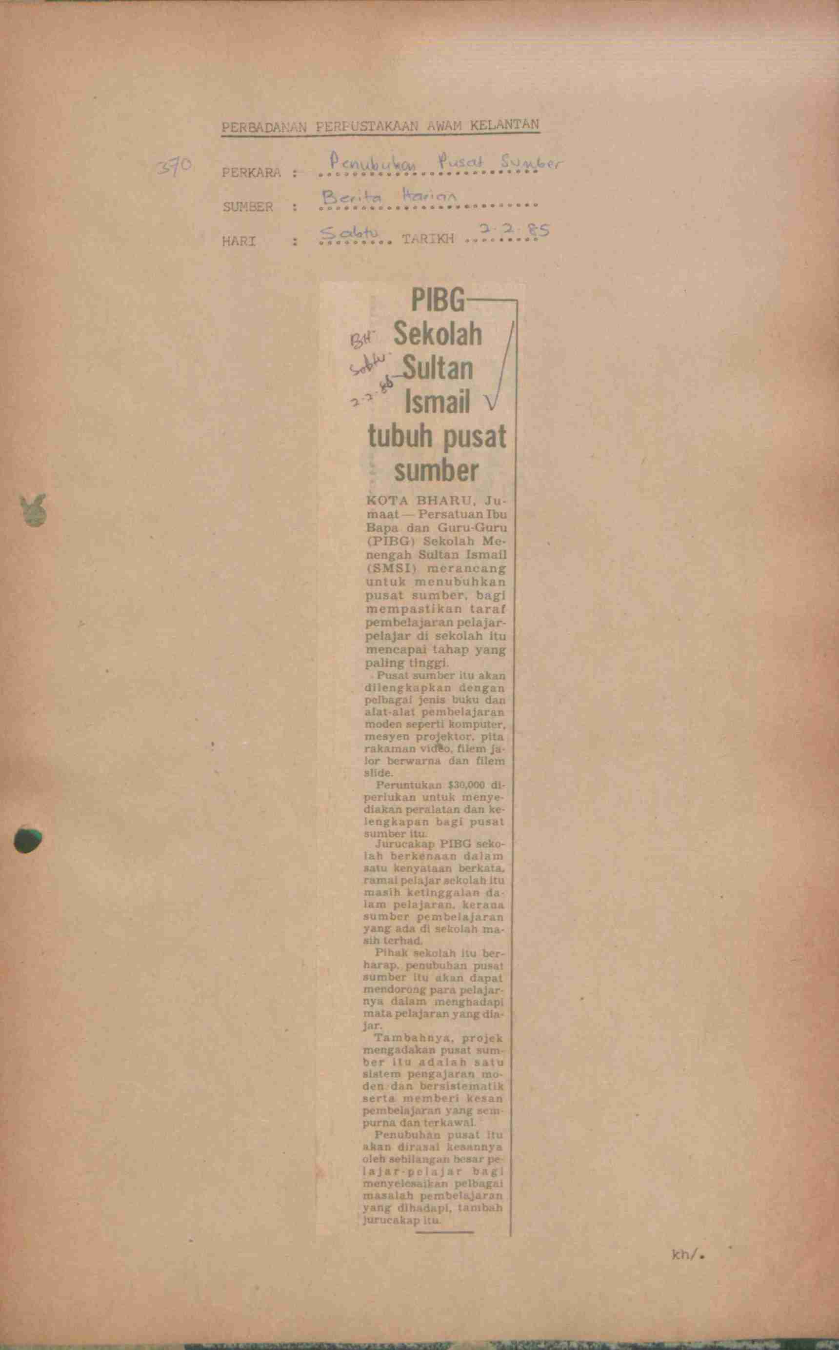 Berita Harian (1988) PIBG Sekolah Sultan Ismail tubuh pusat sumber. Berita Harian. |